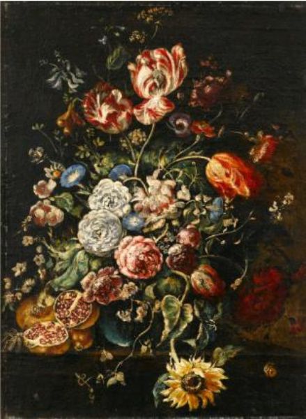 | STILL LIFE OF FLOWERS INCLUDING PARROT TULIPS, CARNATIONS AND WITH POMEGRANATES IN A GLASS VASE UPON A STONE LEDGE; | |