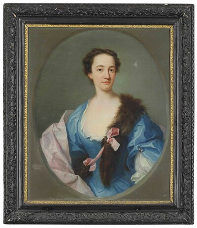 | Portrait of a lady, half-length, in a blue dress, pink wrap and fur stole, in a feigned oval | |