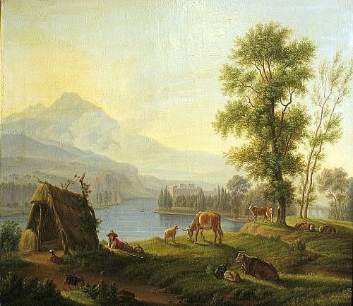 An extensive landscape with cattle and goats resting in the foreground