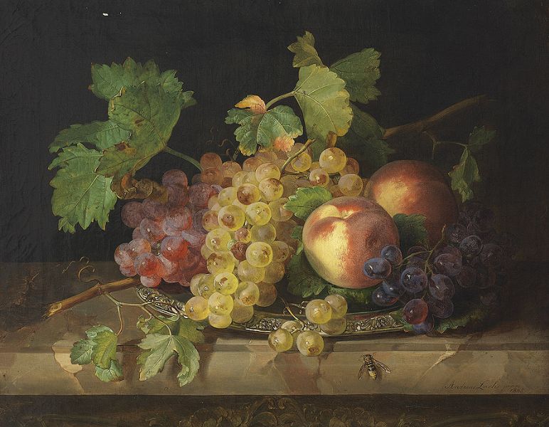 | Prachtvolles Früchtestilleben mit Insekt. Trauben und Pfirsiche auf Silberplatte | |