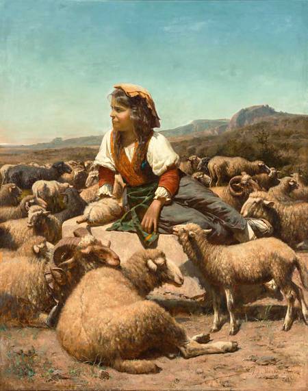 Young shepherdess in picturesque costume with sheep flock in wide Italian landscape.
