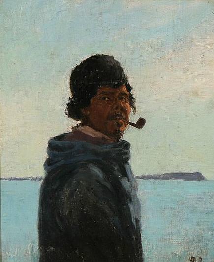 | A man from Greenland dressed in a blue anorak while smoking a pipe | |