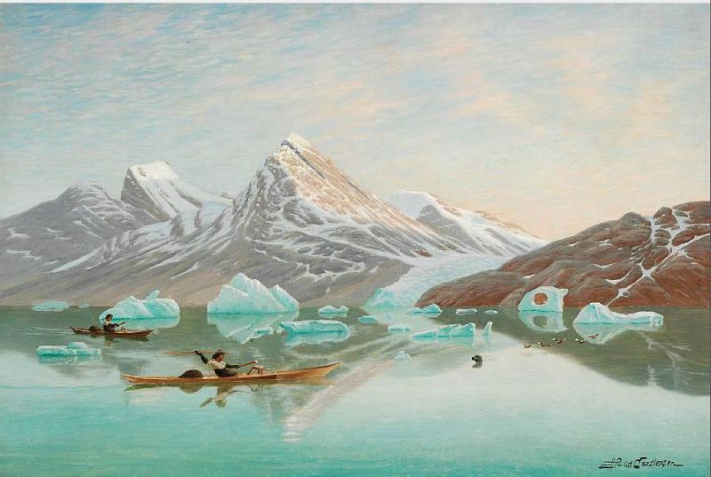 | View of a Greenlandic fiord with trappers in their kayaks hunting seals | |