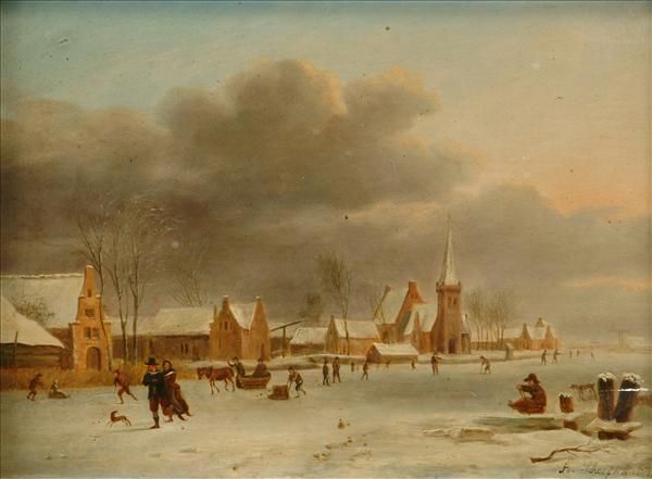 Winter Landscape, figures on a frozen river before a town