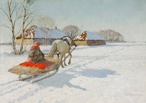 A winter scene with a figure on a horse-drawn sleigh