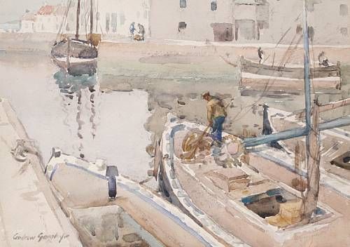 Harbour scene; Fisherman onboard