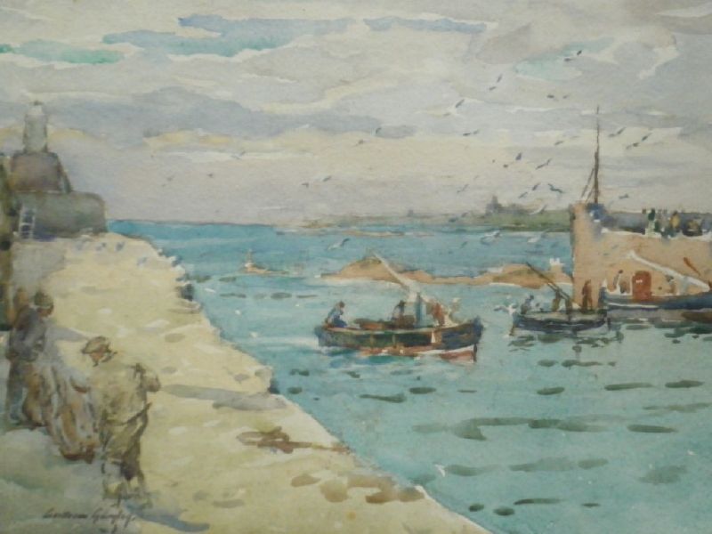 Harbour scene with figures and fishing boats