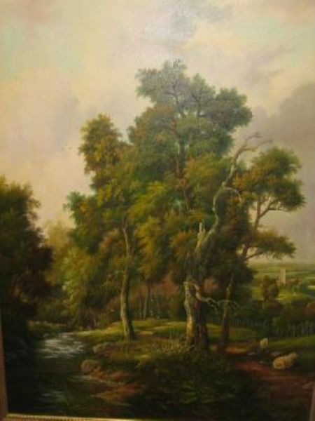 | Landscape with Sheep by a Woodland Stream, Church Tower in the Distance | |