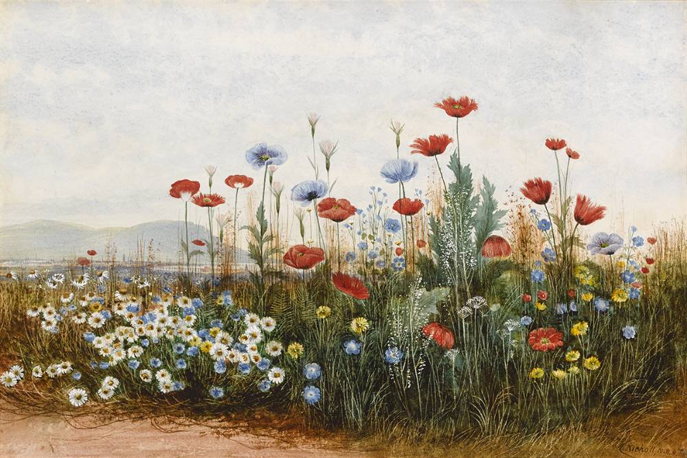 BANK OF WILD FLOWERS, POPPIES AND DAISIES