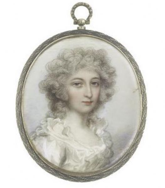 A Lady, wearing white dress with frilled collar, her hair powdered.