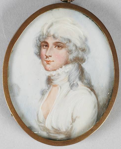 A lady, bust length, wearing a white dress with a lace collar, her hair curled