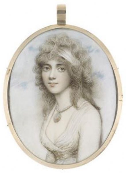 | A Lady, wearing a portrait miniature of an officer on a pearl necklace suspended from her neck, white dress and bandeau in her p | |