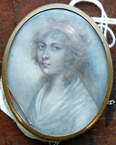A Lady, white dress and fichu, a pink bandeau in her powdered hair.