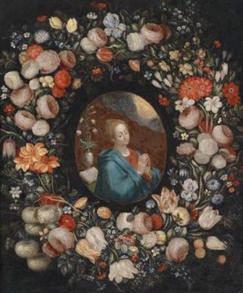 | A garland of flowers surrounding a cartouche enclosing the Virgin Annunciate | |