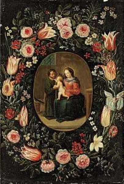 | Blumengirlande mit Heiliger Familie in der Zimmermanns-Werkstatt | |