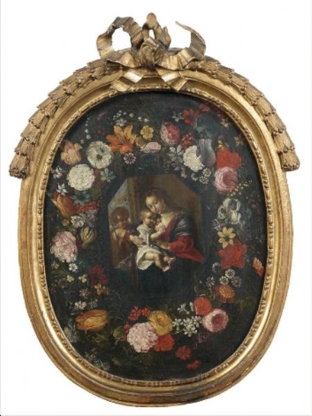 Guirlande de fleurs entourant une Vierge à l’Enfant