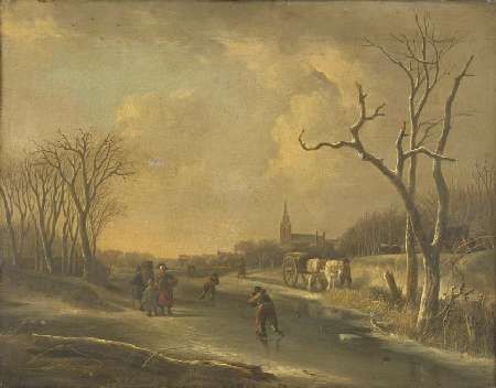 A WINTER LANDSCAPE WITH SKATERS ON A FROZEN LAKE.