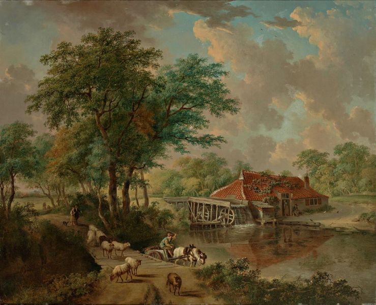 | Flusslandschaft mit Wassermühle und Figurenstaffage mit Schafherde an einem Sommertag. | |