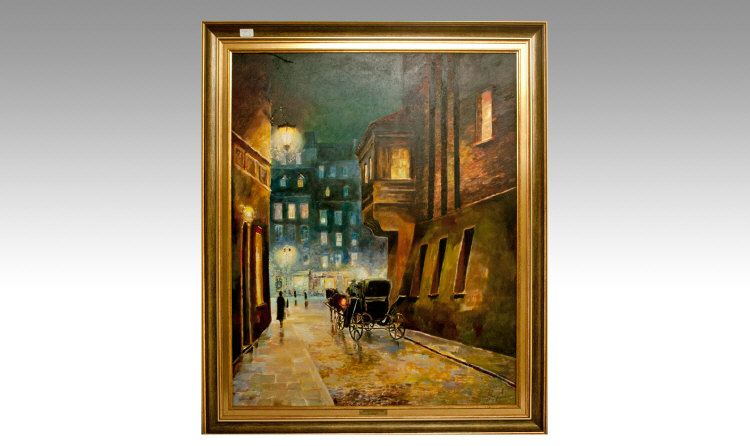 Horse Drawn Carriage in a Lamp Lit City Street'
