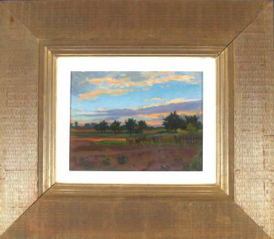 Gemüsegarten vor baumbestandener Abendlandschaft