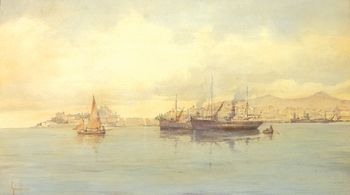 | Corfu, steam ships and fishing boats under sail in the harbour | |