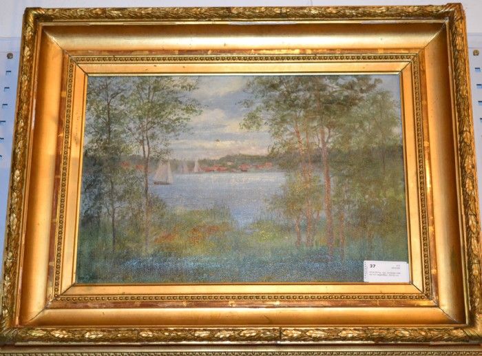 landskap med sjö och segelbåtar