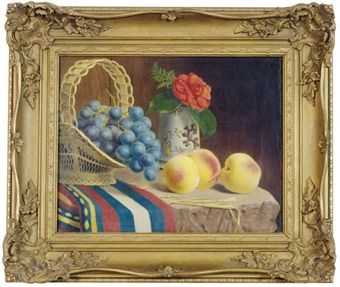 | Still life of a rose in a Chinese porcelain tankard and grapes and peaches on a table | |