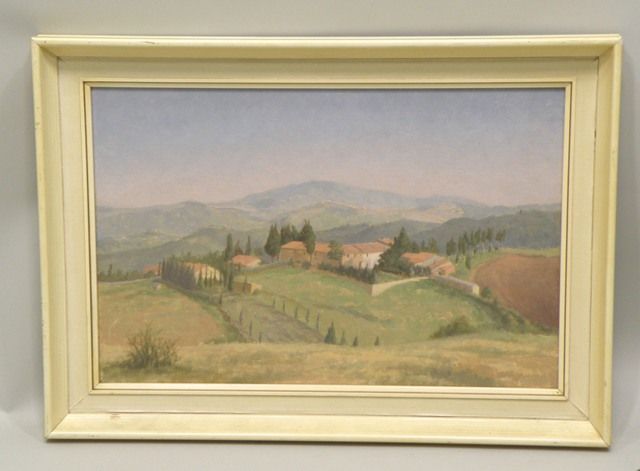 A hill top farm with conifers in sunlight, further undulating hills beyond