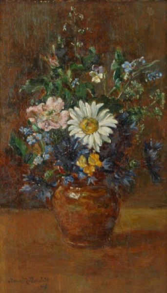 Stilleben med blommor i lerkrus