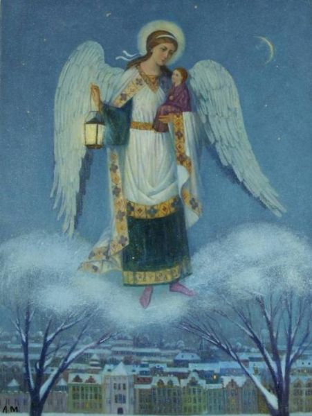 Engel mit Kind. Schwebend über Hausdächer in winterlicher Landschaft.