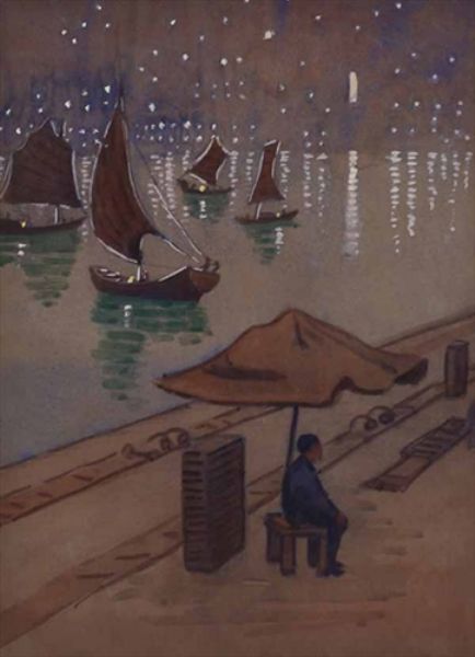 Junks in the Moonlight at with figure seated at the quayside