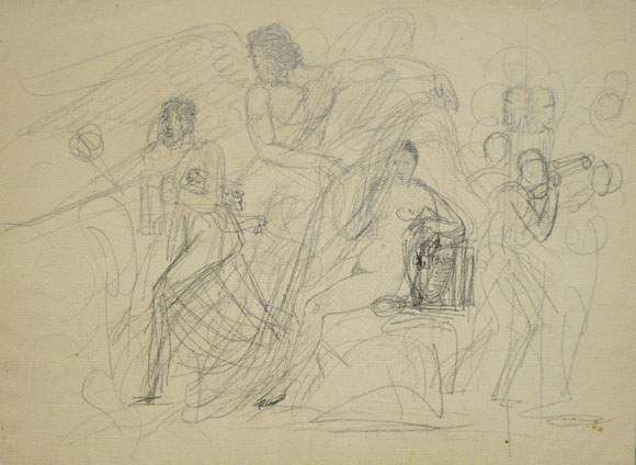 | Feuille d'étude : Femme accoudée à une urne, génie ailé la voilant | |