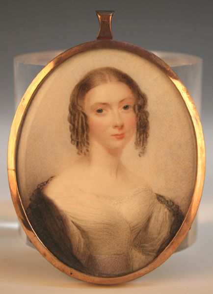 | Oval Miniature Half Length Portrait of a Lady, her Hair in Ringlets and wearing a White Décoletté Dress and Black Lace Shawl | |