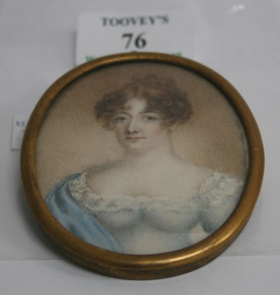 Oval Miniature Portrait of a Lady with Curly Hair wearing a Blue Dress