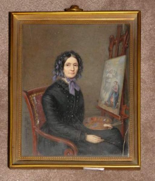 | Portrait de femme assise devant son chevalet tenant une palette et des pinceaux | |