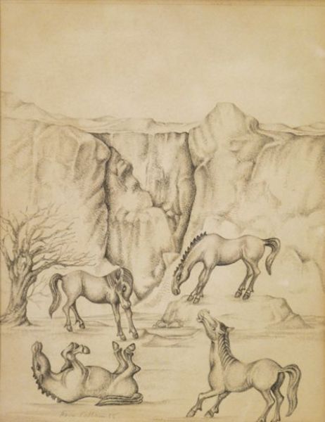 FOUR HORSES WITH MOUNTAIN LANDSCAPE