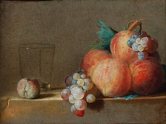| Nature morte aux pêches, raisins et verre déposés sur un entablement | |