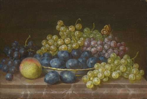 Stillleben mit Weintrauben, Pflaumen und einem Pfirsich