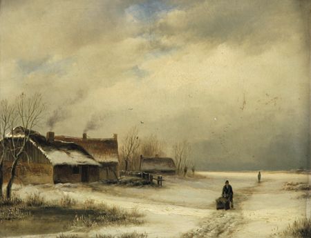| Gehöft in winterlicher Landschaft.- Unter hohem, wolkenverhangenem Himmel bäuerliches Anwesen mit Figurenstaffage in schneebedec | |