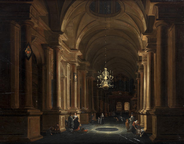 A church interior with elegant figures