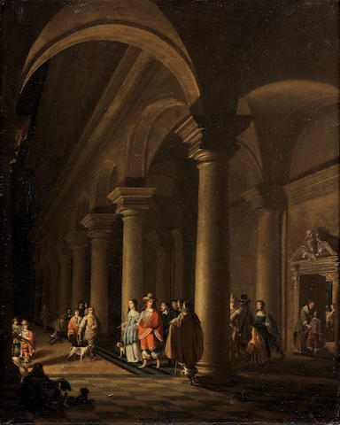 Elegant figures in a church interior
