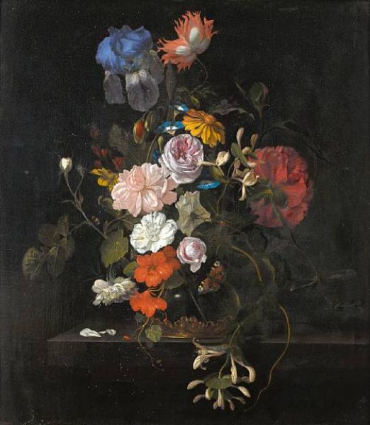 | An iris, honeysuckle, roses and other flowers in a glass vase on a table-top | |