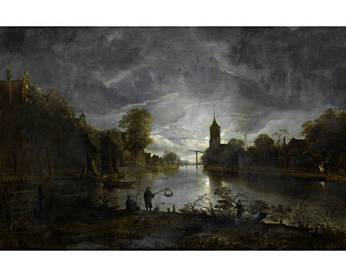 | A moonlit river landscape with fishermen on a shore and a village in the distance | |