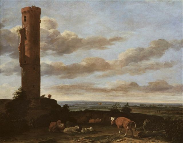 A shepherd with cattle and sheep by a tower in a panoramic landscape