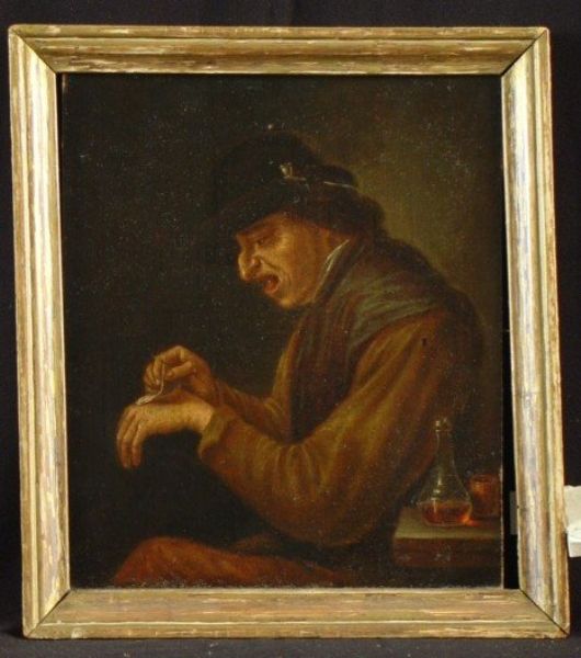 | Bildnis eines Mannes mit Wundverband in bäuerlichem Gewand, die Keramikpfeife in den Hut gesteckt, daneben Konsole, Becher und W | |