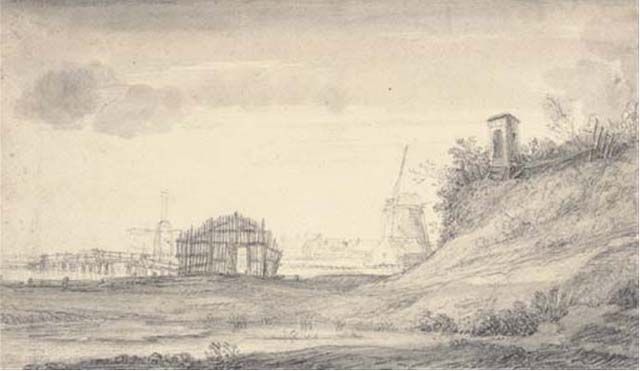| A sandy bank by the Zaagmolenpoort, Amsterdam, with the city seen in the distance | |