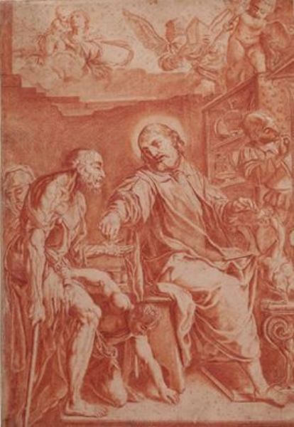| Der Hl. Bischof Eligius, Patron der Goldschmiede, in seiner Werkstatt, Almosen austeilend | |
