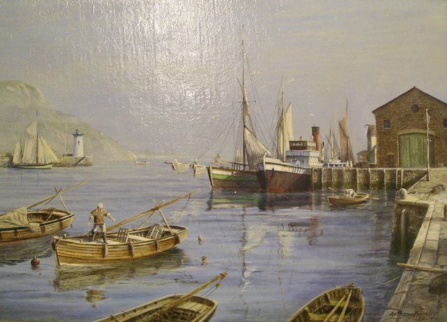 A harbour scene in sunlight with a fisherman pulling his floats, light house and cliffs behind