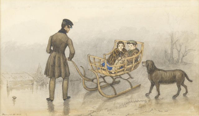 | 'Anthony, Frank and Caroline sledging on the ice, accompanied by the family dog, 30 December 1844' | |