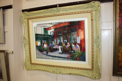French street scene with pavement cat and restaurants